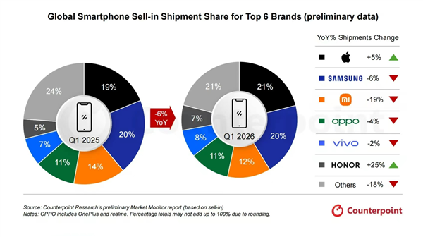 三星以20%份额紧随其后,出货量同比降6%,受S26系列发布推迟及入门级市场疲软拖累。
