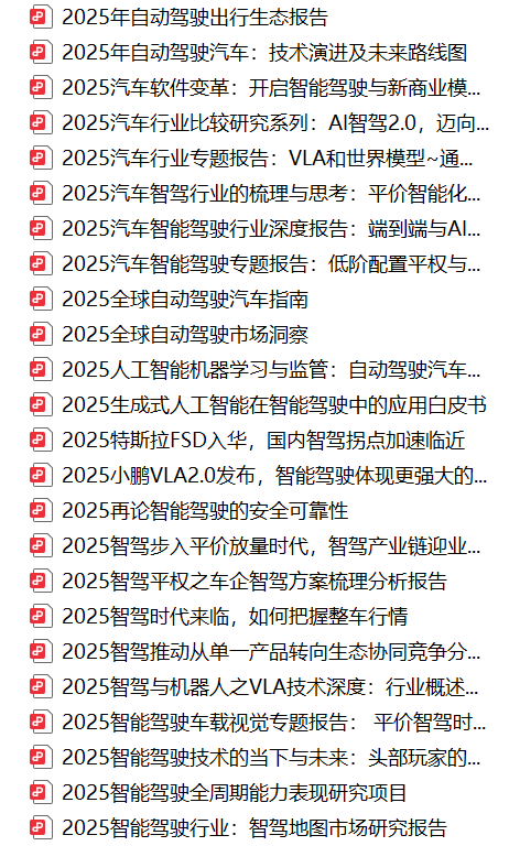 扫码加入知识星球获取PDF完整版报告阅读专区:摩根大通:2026年汽车行业恐遇历史性寒冬2026年整车企业智驾方案梳理智驾行业2026年展望:从辅助驾驶走向物理AI汽车及零部件2026年展望:智能提速、格局再塑与全球化持续2025-2026年汽车技术发展趋势报告2026年度中国汽车十大技术趋势2026汽车行业展望研判分析报告:鏖战升维,破界竞争汽车行业2026年策略报告:“智能驾驭,电动未来”加速发展德勤:2026生成式AI驱动汽车产业价值重构白皮书2026年汽车行业十大趋势及投资策略2026汽车线控制动EMB市场研究报告2025年增程汽车深度分析报告:现状、技术路线及产品力总结、展望2025中国汽车全球化战略白皮书(含欧洲、拉美、中东、出海分析)2025年零跑汽车竞争优势、国内外市场销量及未来产品布局分析报告2026比亚迪市场竞争力分析报告:吉利与小米谁更能威胁比亚迪2025比亚迪高端化战略:科技安全并举,重塑新能源豪华格局2026汽车智能座舱深度分析:技术阶段、发展路径、竞争格局2026华为乾崑智驾深度分析及拆解报告2025网联化汽车娱乐趋势洞察调研报告2025汽车智能制造技术路线图解读2025生成式AI在智能驾驶中的应用白皮书2026香港电动车普及路线图基于自动驾驶的线控底盘技术现状和发展趋势2026年充换电场景的自动驾驶应用标准化需求研究报告2025年中国汽车产业出海回顾分析:乘用车篇2025年中国汽车产业出海回顾分析:商用车篇2025年中国汽车产业出海回顾分析:政策篇2025年中国汽车产业出海回顾分析:用户篇