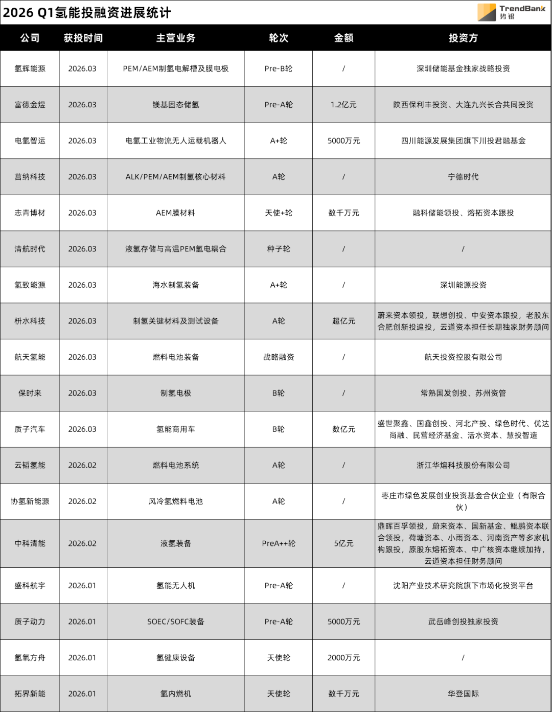 综合来看,2026年Q1氢能融资释放出强烈的行业洗牌信号。势银(TrendBank)认为,当前氢能产业已走过“讲故事”阶段,进入拼产品、拼成本、拼场景的实质竞争期。