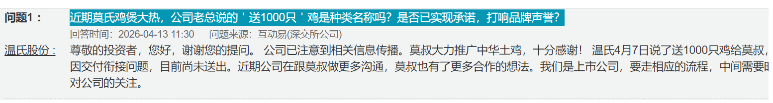 4月13日,针对投资者关于“近期莫氏鸡煲大热,公司老总说的'送1000只'鸡是种类名称吗?是否已实现承诺?”的提问,温氏股份在互动平台回应,温氏4月7日说了送1000只鸡给莫叔,言出必行。因交付衔接问题,目前尚未送出。“近期公司在跟莫叔做更多沟通,莫叔也有了更多合作的想法。公司是上市公司,要走相应的流程,中间需要时间。”