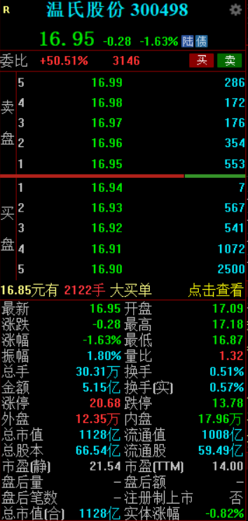 截至午间收盘,温氏股份跌1.63%,现报16.95元/股,成交额5.15亿元,总市值1128亿元。