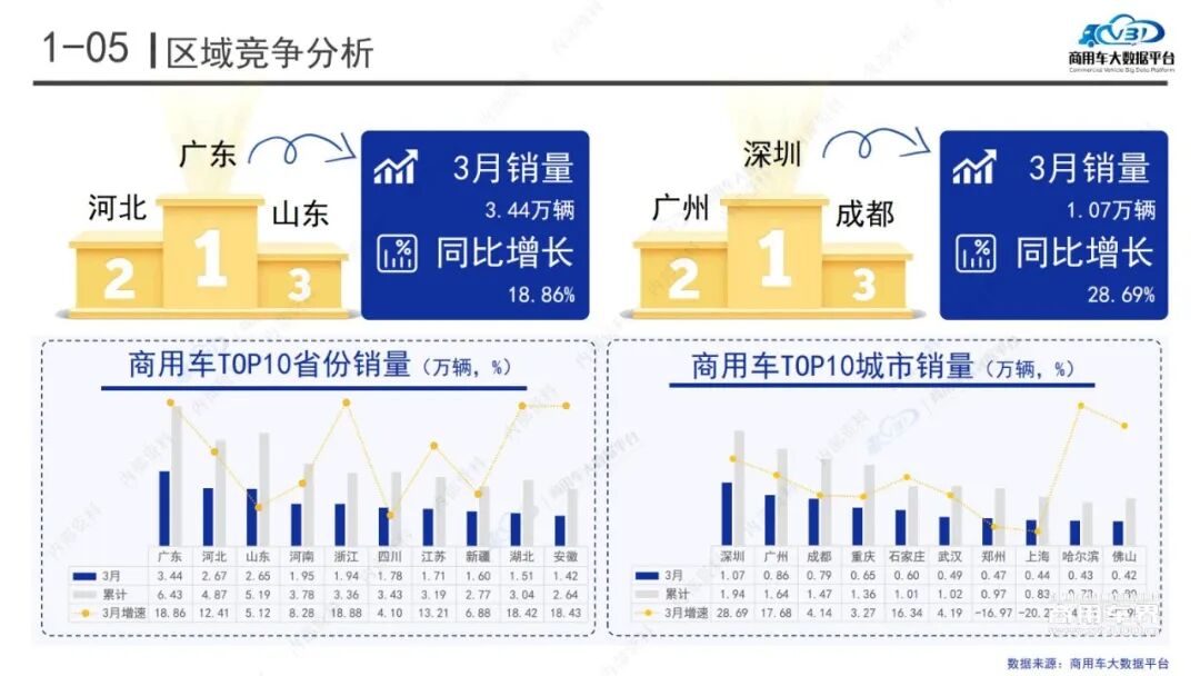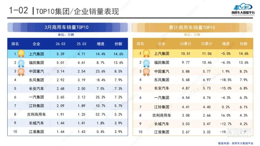 全国商用车大数据平台信息显示,2026年1-3月国内商用车销量为66.84万辆,同比降6.97%。在集团总销量层面,上汽集团、福田汽车、中国重汽集团、东风汽车集团、长安汽车集团分别位列前5名,其中中国重汽集团实现了1.9%的正增长。从区域销量来看,广东、河北、山东分别位列前3名,均实现了正增长。