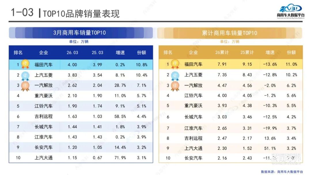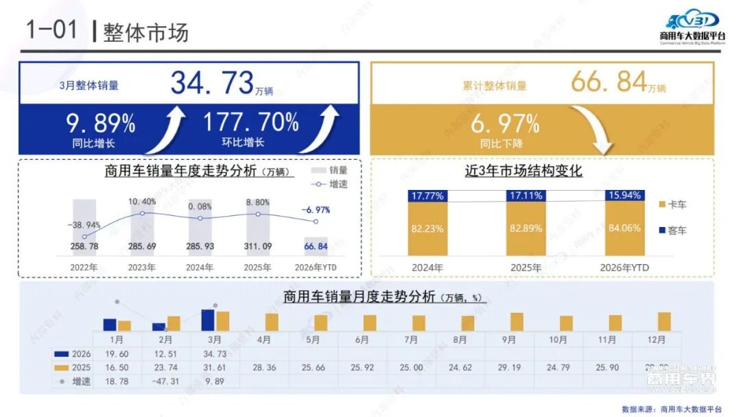 国内商用车销量:2026年1-3月共销售66.84万辆,同比降6.97%