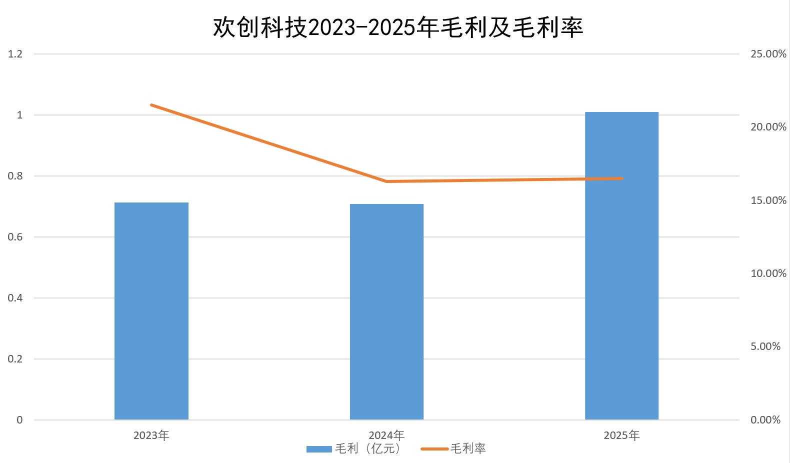 过去三年(2023年-2025年,下同),欢创科技的毛利分别为0.713亿元、0.708亿元、1.01亿元。2024年公司毛利小幅下滑0.6%,2025年大幅反弹,同比增长42.6%,首次突破1亿元。这三年公司毛利率分别为21.5%、16.3%、16.5%。
