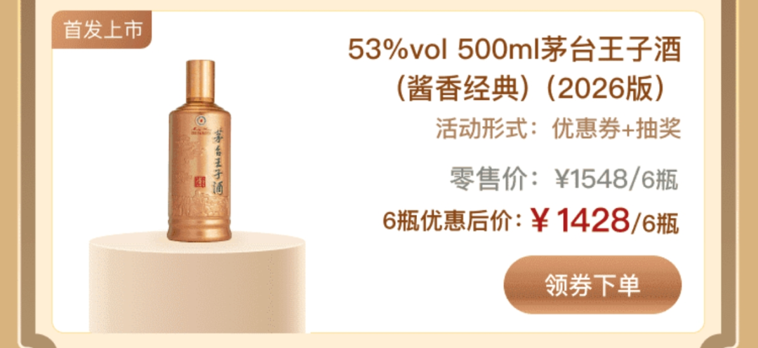 此外,4月15日09:00-4月24日23:59活动期间53%vol 500ml茅台王子酒(酱香经典)(2026版)6瓶装优惠价为1428元,即238元/瓶,较零售价优惠20元/瓶。
