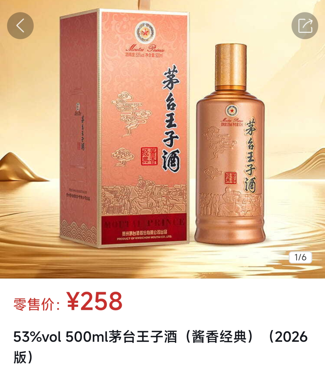 据i茅台官方页面显示,53%vol 500ml茅台王子酒(酱香经典)(2026版)零售价258元/瓶。相较此前已下架的 2.0 版本398元/瓶的零售价,新款价格直降140元,降幅达35%。