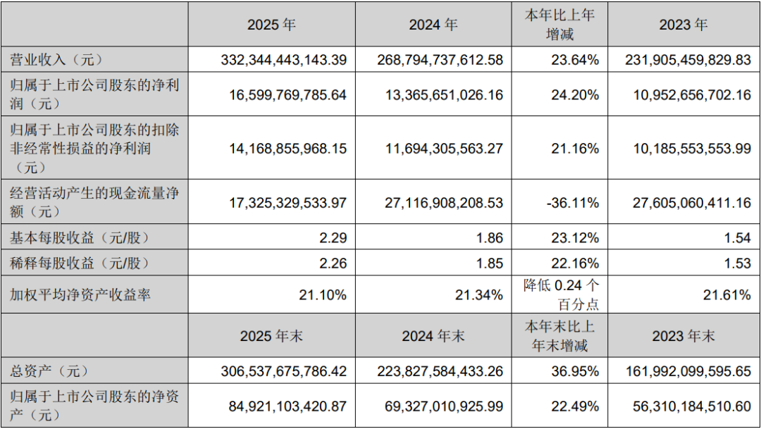 报告期内,公司实现营收3323.44亿元,同比增长23.64%;归母净利润166亿元,同比增长24.20%;扣非净利润141.69亿元,同比增长21.16%。