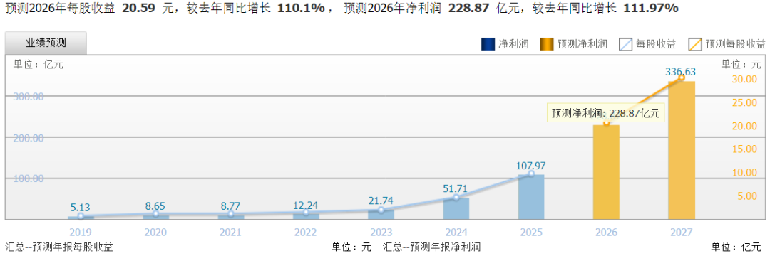 根据数据,6个月内有33家机构做出2026年度业绩预测,其中净利润一致性预期是228.87亿元,同比增长111.97%。这个数据对比“提前发布一季报”这一动作来看,气氛都烘托到这里了,那么一季度超预期应该是十有八九了。