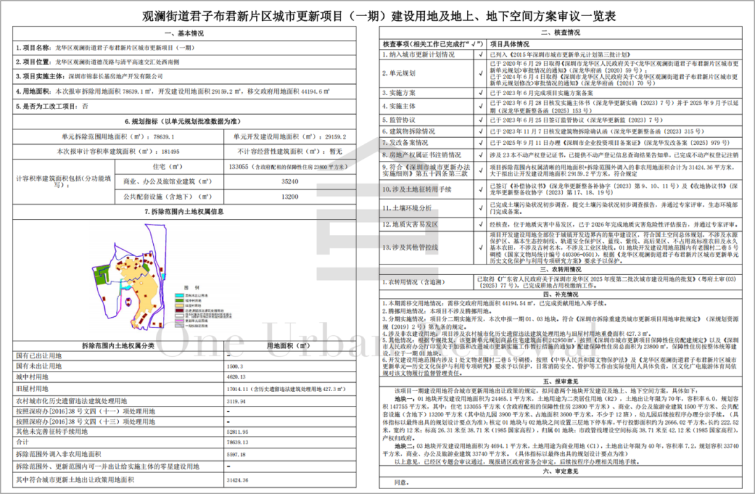 龙华区观澜街道君子布君新片区城市更新项目(一期)建设用地及地上、地下空间方案批复的公告