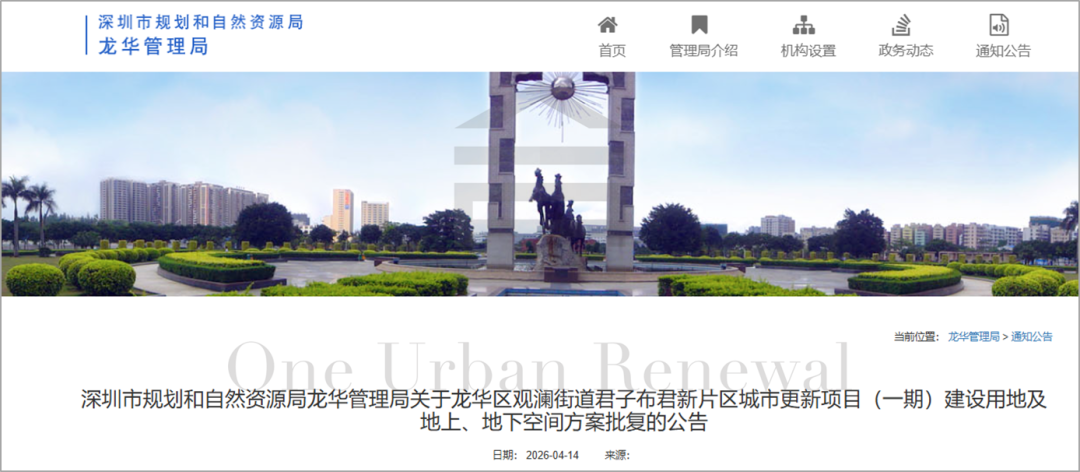 4月14日,深圳市规划和自然资源局龙华管理局关于龙华区观澜街道君子布君新片区城市更新项目(一期)建设用地及地上、地下空间方案批复的公告。