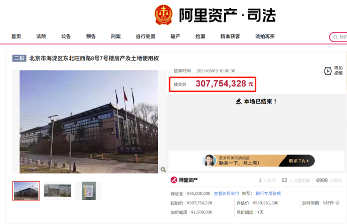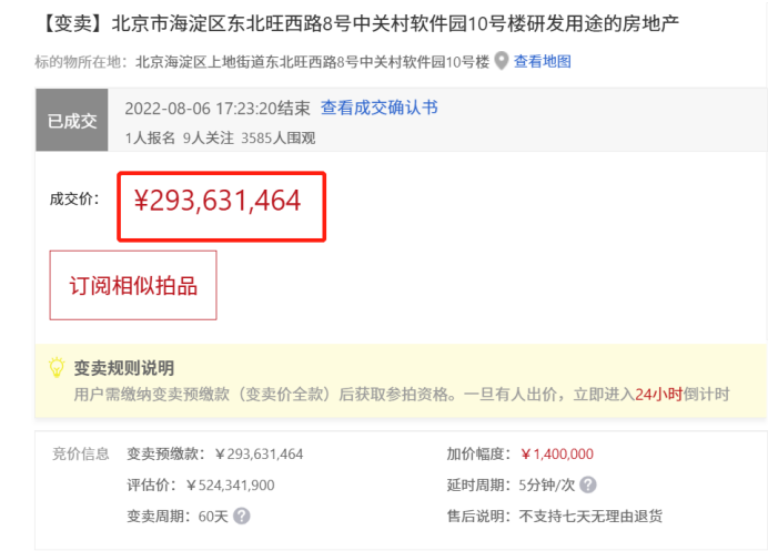 2022年8月6日,北京市第一中级人民法院公开变卖东北旺西路8号中关村软件园10号楼研发用途的房地产,该标的建筑面积14584.58平方米,产权面积19305.40平方米,房屋用途为研发,评估价约5.243亿元,最终变卖价约2.94亿元,折合单价约2万元/平米。