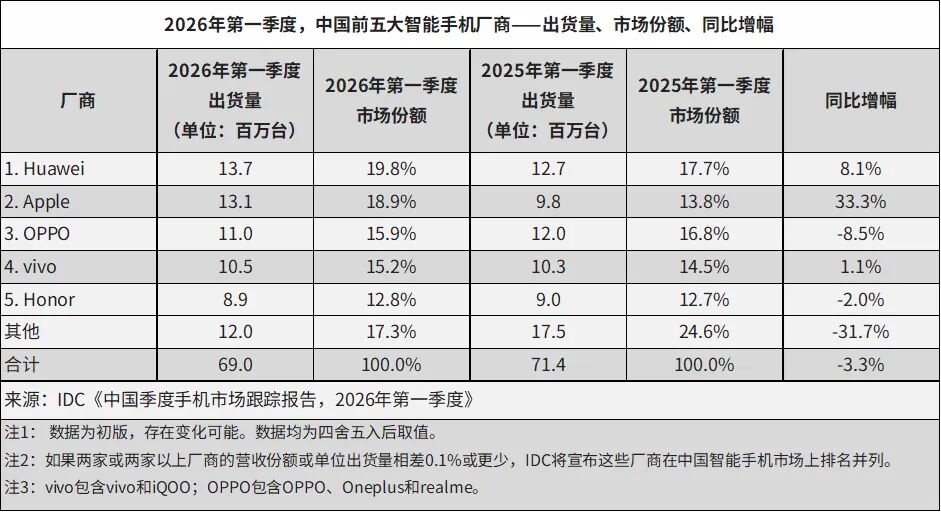 放眼国内,在全球智能手机市场整体收缩的大环境下,一季度国内终端市场同样承压。IDC数据显示,2026年第一季度,中国智能手机市场出货量约为6901万台,同比下降3.3%。