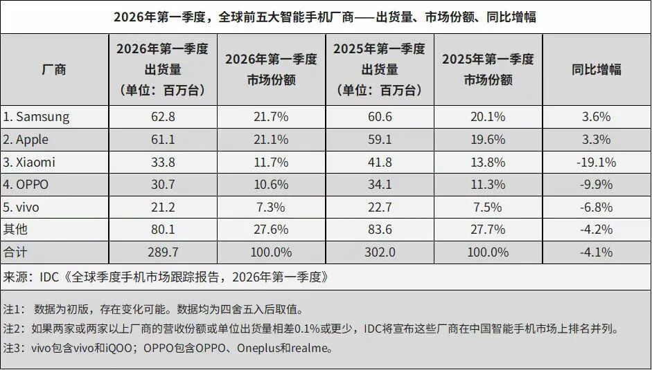 4月15日,IDC最新发布的《全球季度手机跟踪报告》初步数据显示,2026年第一季度(1Q26),全球智能手机出货量同比下降4.1%,至2.897亿部,这打破了自2023年年中以来市场连续十个季度的增长势头。对比来看,2025年同期全球智能手机出货量为3.049亿部,本季度行业出货规模同比缩减1520万部,市场下行态势凸显。