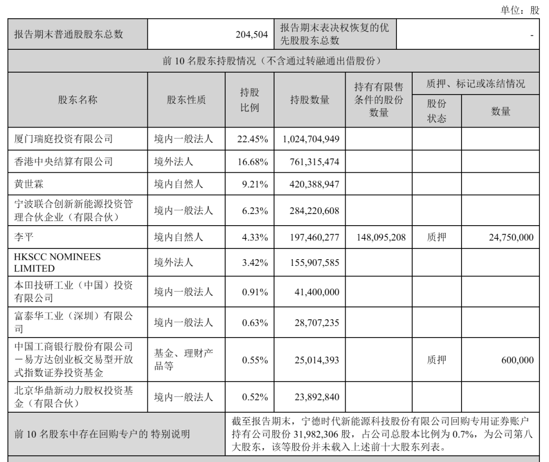 需要注意的是,宁德时代H股的占比只有3.42%,大幅小于A股的总股本。