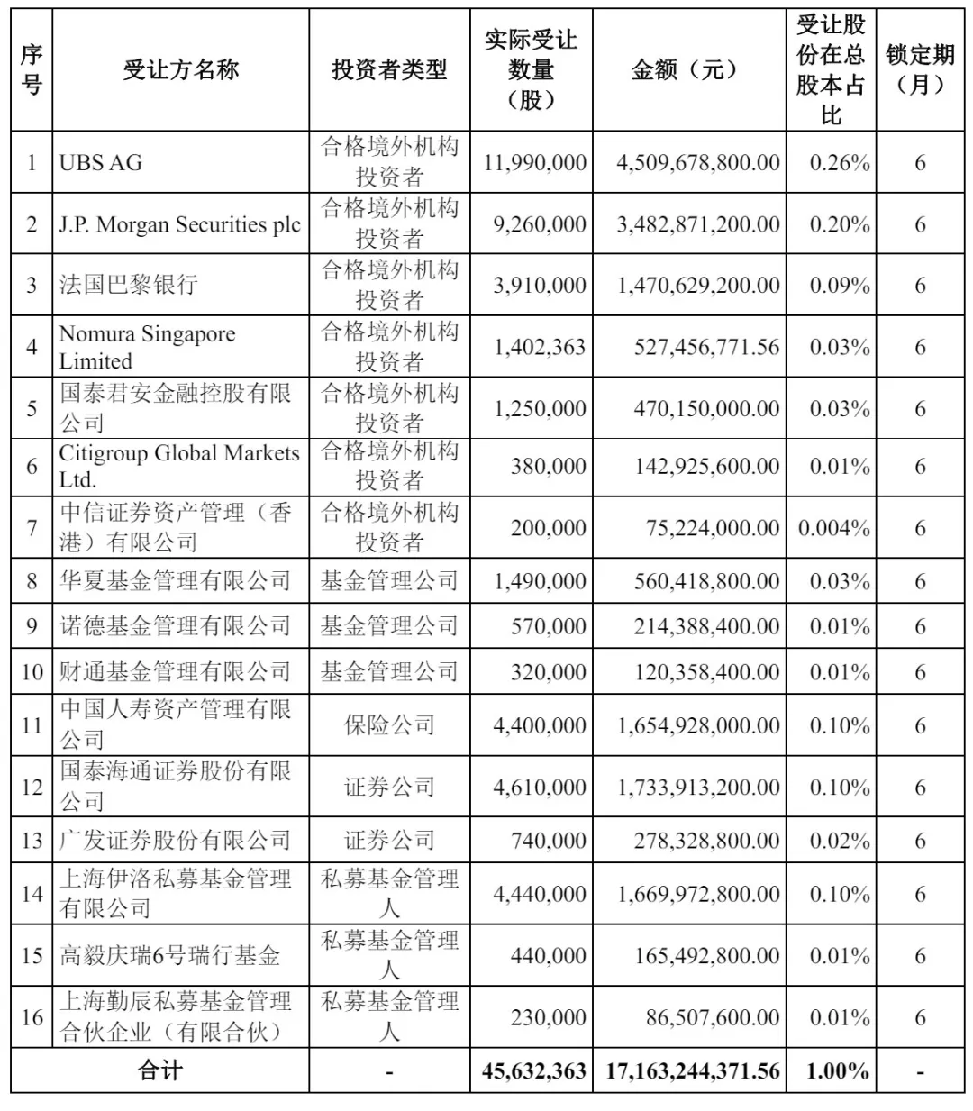 其中,UBS AG认购45.1亿元,J.P. Morgan Securities认购34.83亿元,法国巴黎银行认购14.71亿元,Nomura Singapore认购5.27亿元,国泰君安金融控股有限公司认购4.7亿元,Citigroup Global Markets认购1.43亿元,中信证券资产管理(香港)有限公司认购7522万元;