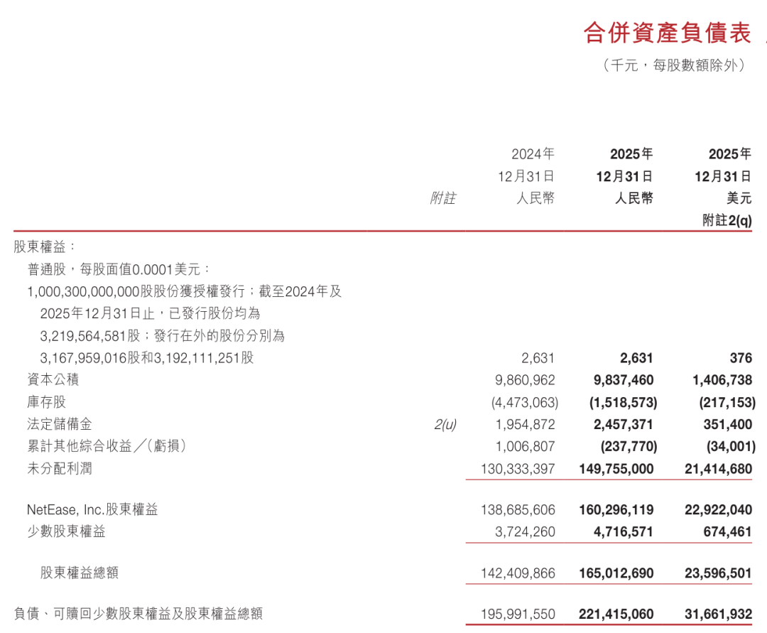 截至2025年12月31日,网易股东权益总额为1650亿元(约236亿美元)。