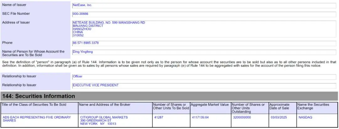 据网易递交给美国SEC的文件显示,网易执行副总裁丁迎峰于2025年3月3日减持41287股,套现411.71万美元(约3001万元)。