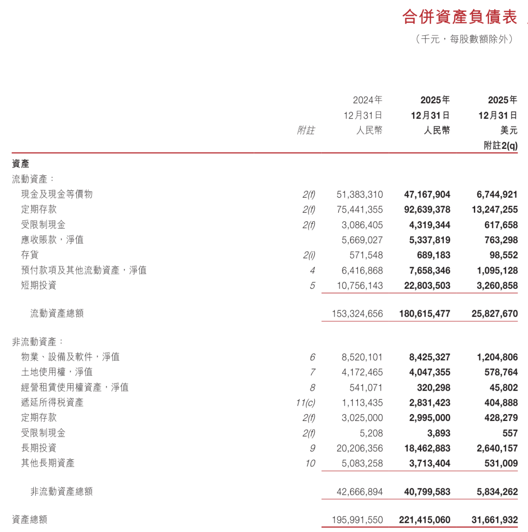 截至2025年12月31日,网易总资产为2214.15亿元(约316.62亿美元),其中,流动资产为1806.15亿元(约258.28亿美元),非流动资产为408亿元(约58.34亿美元)。