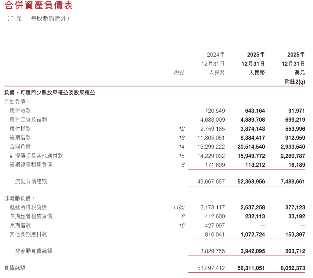 截至2025年12月31日,网易负债总额为563亿(约80.5亿美元),其中,流动负债总额为523.68亿(约74.89亿美元),非流动负债为39.42亿(约5.64亿美元)。