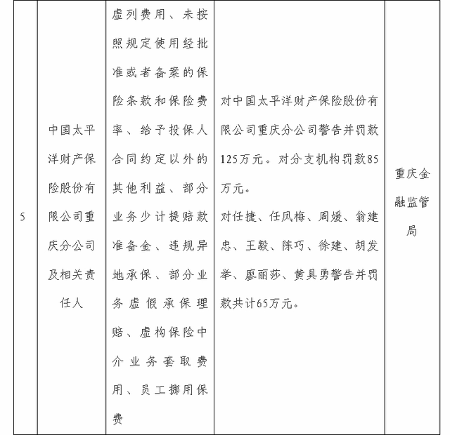 同日,中国太平洋财产保险股份有限公司重庆分公司因虚列费用、未按照规定使用经批准或者备案的保险条款和保险费率、给予投保人合同约定以外的其他利益、部分业务少计提赔款准备金、违规异地承保、部分业务虚假承保理赔、虚构保险中介业务套取费用、员工挪用保费等,被处以警告并罚款125万元,对分支机构罚款85万元。另有10名相关责任人被给予警告并罚款,合计65万元。