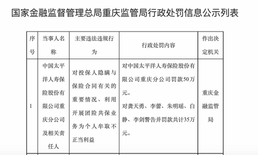 其中,中国太平洋人寿保险股份有限公司重庆分公司因对投保人隐瞒与保险合同有关的重要情况、利用开展团险共保业务为个人牟取不正当利益等,被罚款50万元。与此同时,5名相关责任人被给予警告并罚款,合计35万元。