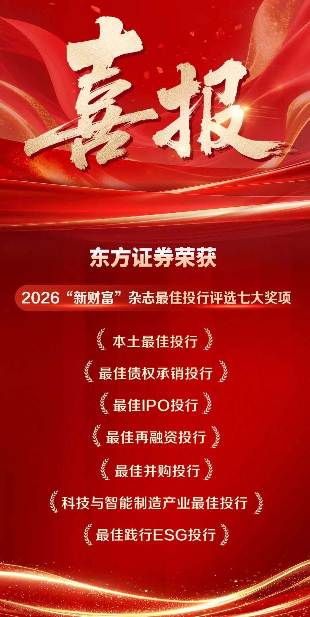 近日,2026“新财富”杂志最佳投行评选结果揭晓,东方证券凭借卓越的业绩成果斩获“本土最佳投行、最佳债权承销投行、最佳IPO投行、最佳再融资投行、最佳并购投行、科技与智能制造产业最佳投行、最佳践行ESG投行”等七大奖项,彰显了市场与专业机构对东方证券综合金融服务实力的高度认可。