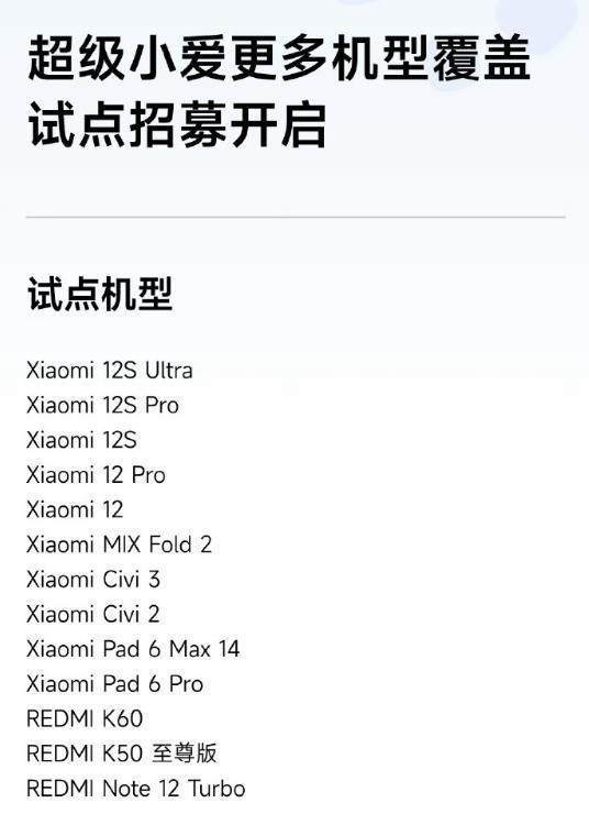 此次试点涵盖了一系列热门设备,包括多款小米及Redmi品牌的智能手机和平板电脑。在手机方面,小米12S Ultra、小米12S Pro等高端旗舰机种均在列;而在平板电脑领域,Xiaomi Pad 6系列中的顶级型号也得到了支持。这意味着,无论是追求极致性能的专业用户,还是寻求性价比的普通消费者,都将有机会提前体验到“超级小爱”的魅力。具体名单参考下图。