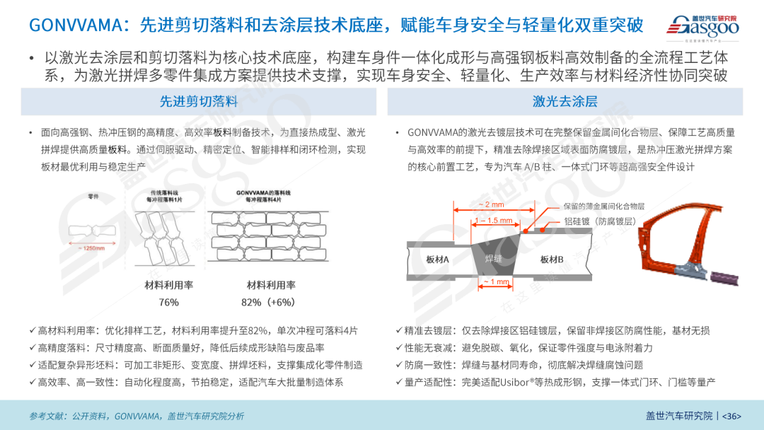 GONVVAMA以先进剪切落料和激光去涂层为核心技术底座,构建起车身件一体化成形与高强钢板料高效制备的全流程工艺体系,为激光拼焊多零件集成方案提供关键支撑,实现材料利用率、焊接可靠性、生产效率与经济性的协同提升,筑牢车身轻量化与安全性能的技术根基。