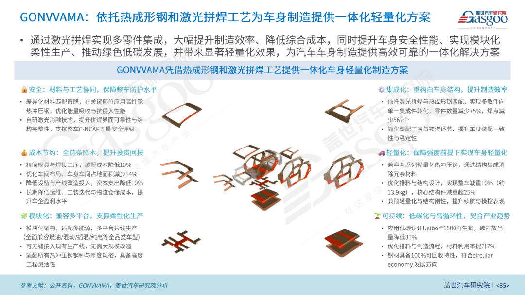 GONVVAMA以热成形钢+激光拼焊为核心技术路径,构建车身一体化轻量化制造体系。依托激光拼焊实现零件集成与焊点精简,同步提升车身抗撞性与制造效率;结合先进剪切落料、激光去涂层等工艺底座,实现材料利用率、焊接性能与量产适配性的全面突破,为多平台柔性生产与绿色低碳发展提供坚实保障。