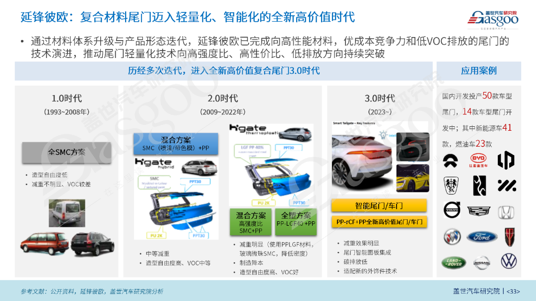 延锋彼欧:复合材料尾门迈入轻量化、智能化的全新高价值时代。通过材料体系升级与产品形态迭代,已完成向高性能材料,优成本竞争力和低VOC排放的尾门的技术演进,推动尾门轻量化技术向高强度比、高性价比、低排放方向持续突破,已成功应用于比亚迪、蔚来、零跑等主流车企超50款车型,成为外饰轻量化领域的标杆实践。