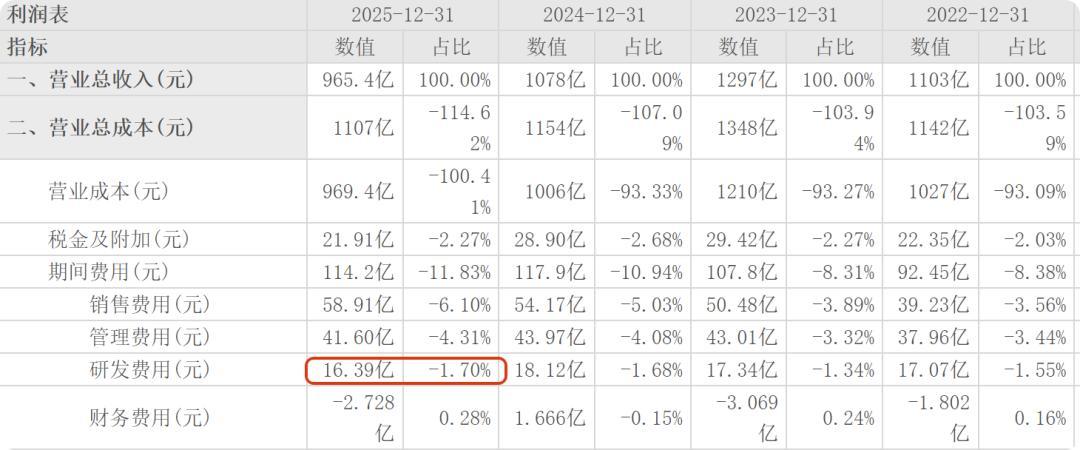 2025年,广汽研发投入16.39亿元,同比下滑9.5%,仅占总营收的1.7%。