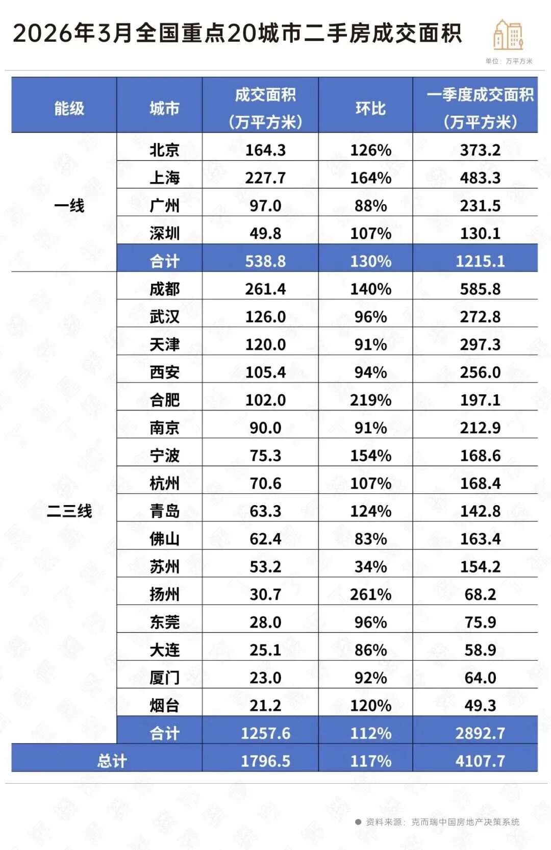 具体城市来看,成都二手房成交面积排在20城首位,达到261万平方米,环比增长140%,同比增26%,累计同比增21%。另外,来自克而瑞深度咨询的数据显示,3月大成都二手房累计成交23248套,时隔十个月再次冲上2万套以上,并处于近一年来的高位。