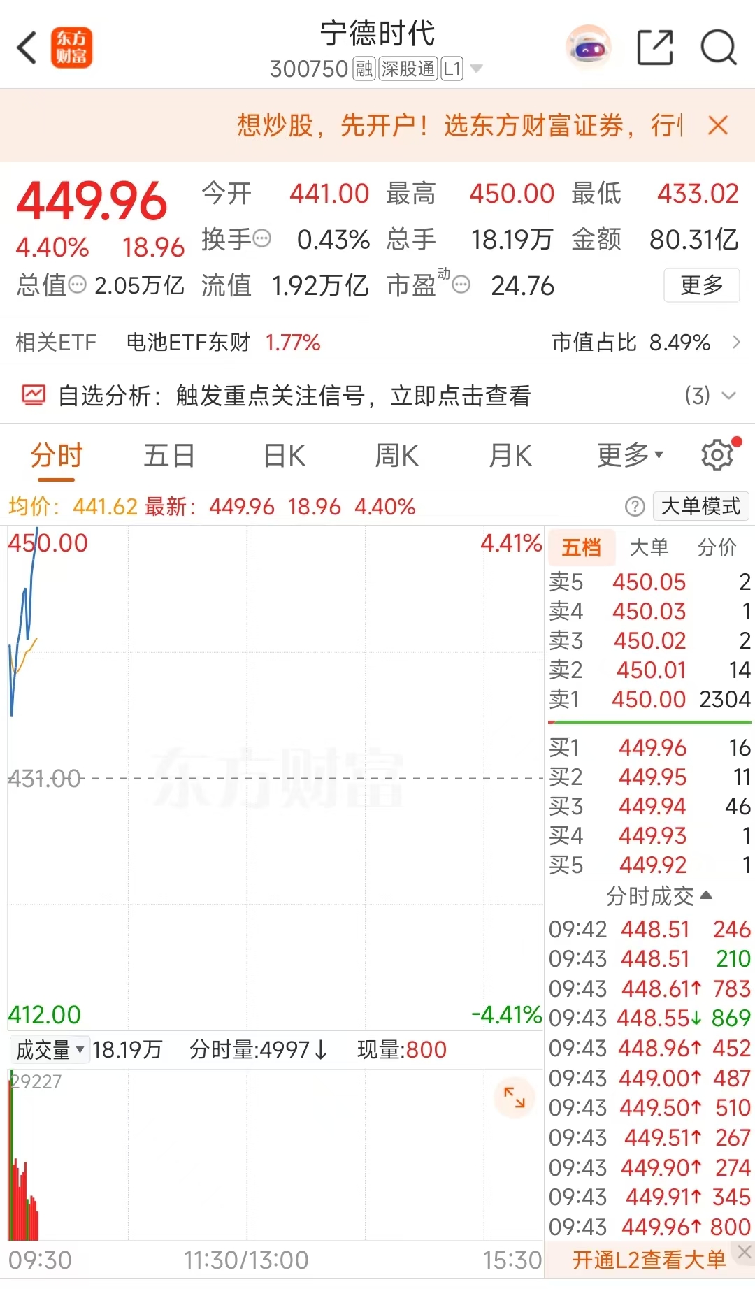 去年下半年以来,宁德时代股价持续上涨,并于近日几度创下新高。4月16日开盘,宁德时代股价上涨,截至9点40分许,涨幅超4.4%,报449.96元,较上年同期近乎翻番,市值达2.05万亿元,再次刷新历史新高。