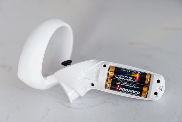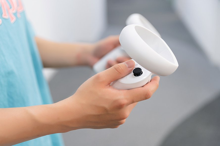 遥控手柄也是VR一体机不可或缺的设备,相比头显来说,Pico Neo 3的遥控手柄倒是有了翻天覆地的变化,Pico Neo 2的遥控手柄小巧归小巧,但要说外观颜值是真不算好看,而这次Pico Neo 3的遥控手柄设计是真的颜值在线了,顶部圆环的造型以及纯白风的设计显得很有青春气息。同时手柄由USB Type – C接口充电改为了2节5号电池进行供电,这样在手柄没电时,只需更换电池就能继续使用手柄进行操控了。