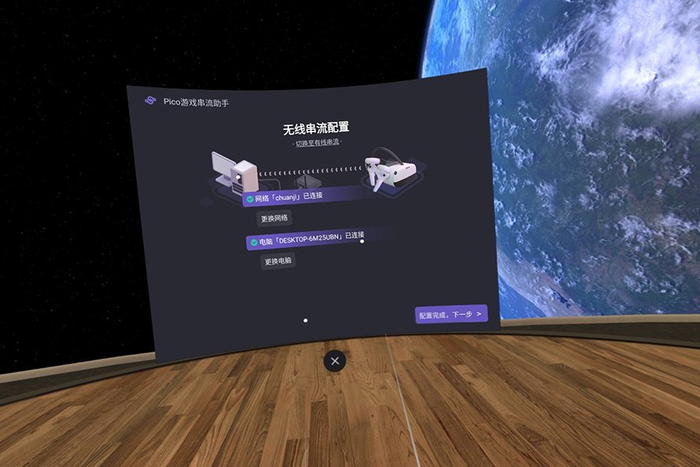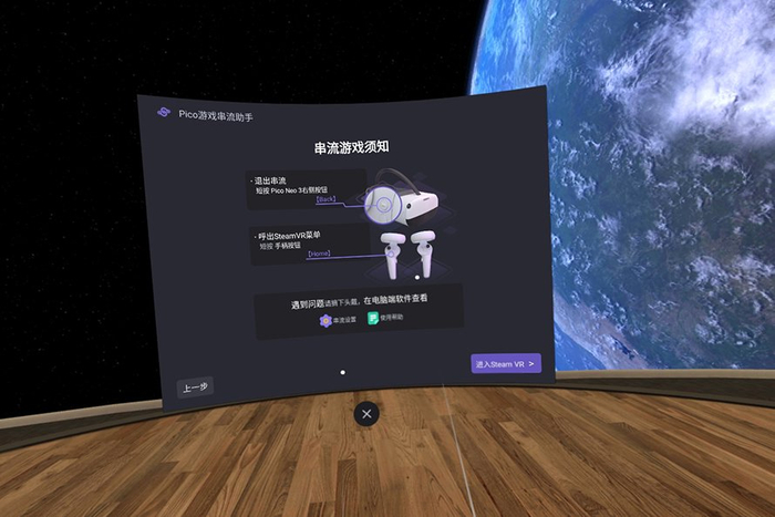 如果有想玩的VR游戏在SteamVR平台上,但Pico Neo 3还没有移植到机内的话也没关系,Pico Neo 3支持有线和无线两种方式串流来玩SteamVR平台上的游戏,要是你的网卡和路由器支持千兆网速的话,小编强烈推荐使用无线串流进行游戏体验,然后在PC端打开《游戏串流助手》软件和SteamVR客户端,Pico Neo 3头显上启动《游戏串流助手》应用,二者配对完成后无限串流就大功告成了,串流过程相当的方便,同时没有线缆的束缚也让我们在游戏时动作幅度可以能大一些,而不会由于线缆的拉扯而影响沉浸式的游戏体验。接下来我们通过几个游戏实际体验来实际考察一下Pico Neo 3的游戏适配工作的完成度究竟如何,之前《SUPERHOT VR》和《OhShape》两款游戏我们都已评测过,这次来体验一下全新的几款大作。