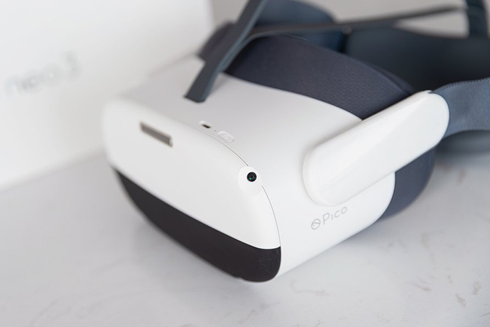 首先我们来看一下Pico Neo 3的外形,它的外观设计整体上延续了Pico Neo 2的样式,黑白灰的配色呈现简约风格的气质,散热孔依旧位于机身正前方的顶部,头显侧翼的的三个实体按键的摆放位置也是如出一辙。耳机孔和音量键也分别居于机身底部的左右两边。