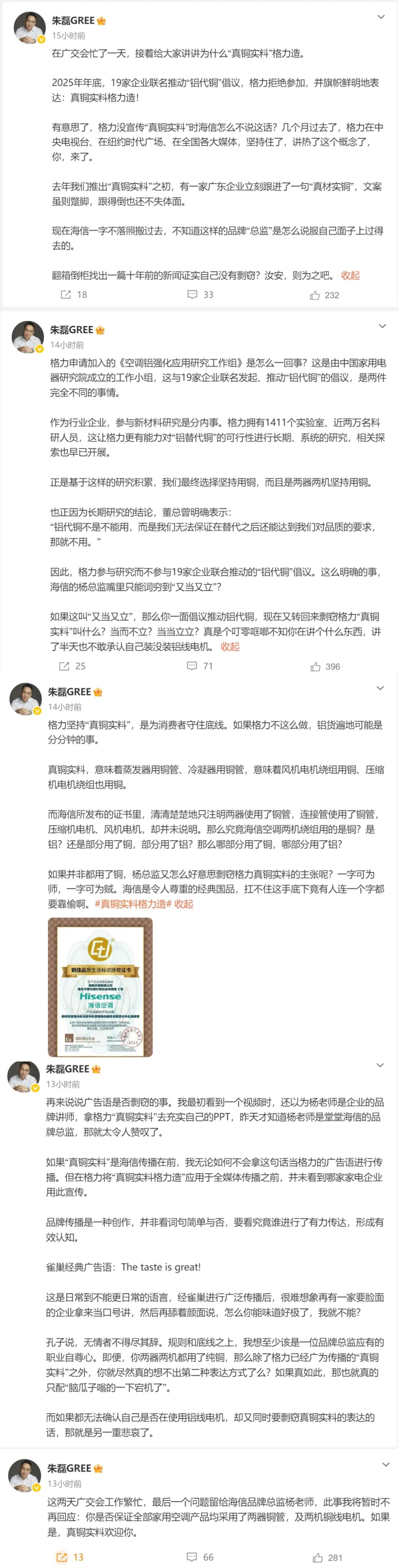 4月15日深夜,格力电器CMO朱磊在社交平台连发五条长文,对海信空气事业部品牌总监杨祥玺此前的言论进行密集回击。