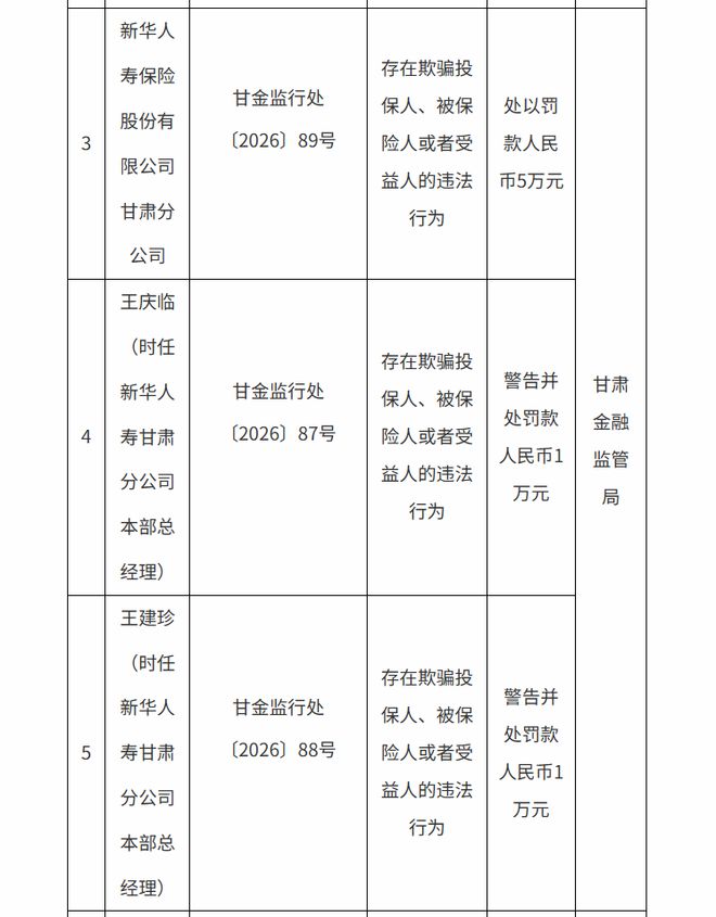 此次监管行动严格落实了“双罚制”原则,除机构受罚外,相关个人责任也被穿透追究。时任新华保险甘肃分公司本部总经理的王庆临与王建珍,因对上述违法违规行为负有直接责任,分别被处以警告并各罚款1万元。
