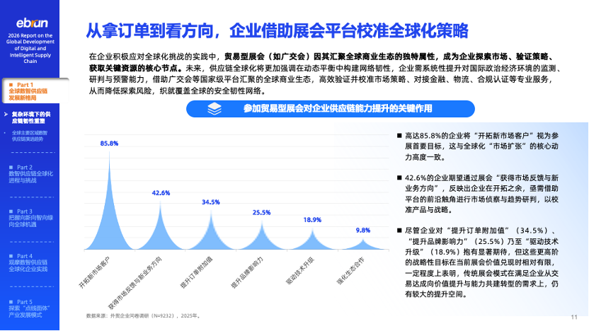 智能引领:超过半数企业计划重点投入AI驱动智能决策,近半数聚焦通过物联网实现供应链可视化。企业在用行动回答两个问题:如何更聪明地决策?如何更透明地看见?观摩数智供应链全球化创新实践