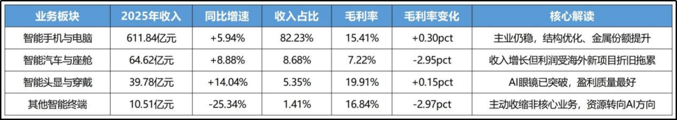 在所有新业务中,智能头显与智能穿戴业务是最“低调”,却也是最扎实的一块。2025年,该业务实现收入39.78亿元,同比增长14.04%,占总收入的5.35%,毛利率高达19.91%,是四大业务中盈利质量最好的板块。