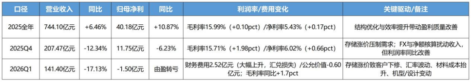 一季报明确指出,营业收入同比下滑17.13%,主要原因是智能手机与电脑类收入减少。管理层在电话会上进一步量化:一季度整体收入较年初规划少了20多亿元,其中汇率折算影响约1亿—2亿元,其余大部分减少来自消费级存储缺货、涨价严重,导致下游客户拉货放缓,结构件、功能模组和整机组装业务均出现不同程度下滑,存储相关因素对利润的影响约4亿—5亿元。这里有一个市场未挖掘点:蓝思的亏损,不是因为“终端需求塌陷”,而是因为其“非组装型结构件厂商”的商业模式,对存储涨价带来的排产扰动更为敏感。