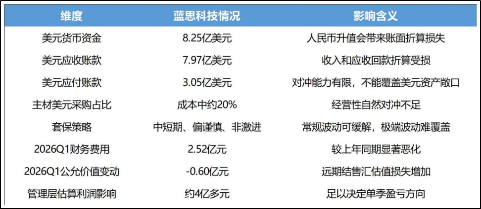从外汇敞口来看,2025年年报蓝思期末的美元货币资金约8.25亿美元,美元应收账款约7.97亿美元,美元应付账款约3.05亿美元,仅“美元货币资金+美元应收账款-美元应付账款”,就存在显著的净美元多头暴露。而更关键的是,公司的经营性自然对冲能力严重不足,虽然从康宁采购玻璃也用美元结算,但这类主材在总成本中的占比仅约20%,剩余80%的成本无法用美元对冲。