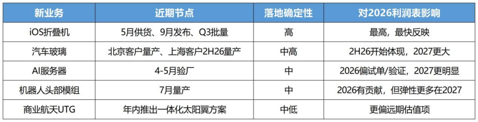 Q1真正的“雷”不是亏损,而是蓝思已经正式进入“投入先行、利润后置”的平台型公司阶段。市场预期2026下半年是公司的业绩拐点,2027年向上是资本市场对蓝思新业务的期待,集中在折叠机、汽车玻璃、AI服务器、机器人、商业航天五大方向,但不同业务的放量节奏差异巨大,并非“齐头并进”。结合公司披露的进展和机构判断,可以将新业务的放量节奏分为“高确定性、中高确定性、中确定性、中低确定性”四类(仅供参考),其中折叠机是最接近利润表的“第一增长曲线”,这与市场普遍将机器人、商业航天视为核心主线的直觉,存在明显差异。