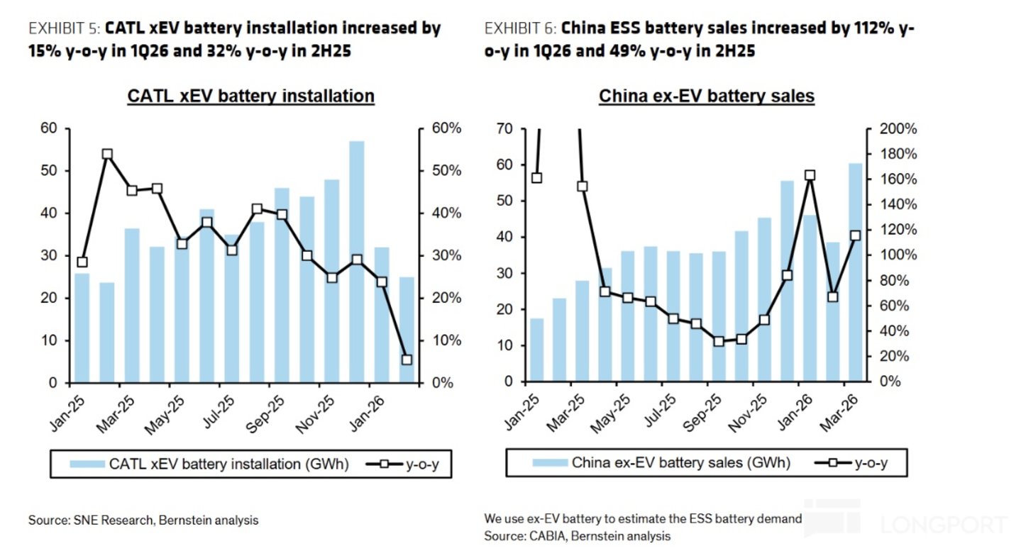 全球化产能释放与产品红利:根据2026年1-2月数据,公司全球动力电池使用量市占率达40.5%(同比+1.8pct),其中海外市占率达32.1%(同比+2.2pct)。随着前期因满产限制而压抑的产能得到释放,叠加神行、麒麟等高质量电池产品的放量,公司在全球市场的统治力进一步巩固。