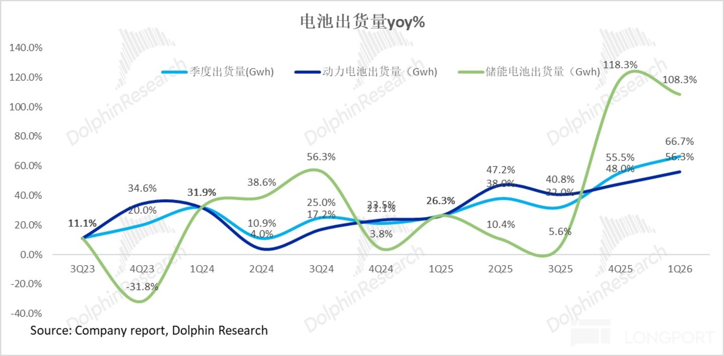 受一季度新能源车市传统淡季及公司自身产能持续扩建(总产能基数变大)的双重叠加影响,公司一季度的产能利用率从2025年下半年的超负荷满产状态(103%)阶段性回落至85%-90%区间。但在分母端不断扩张的背景下,这一利用率水平在全行业中依然处于绝对领先的高位,侧面印证了终端拿货的积极性。