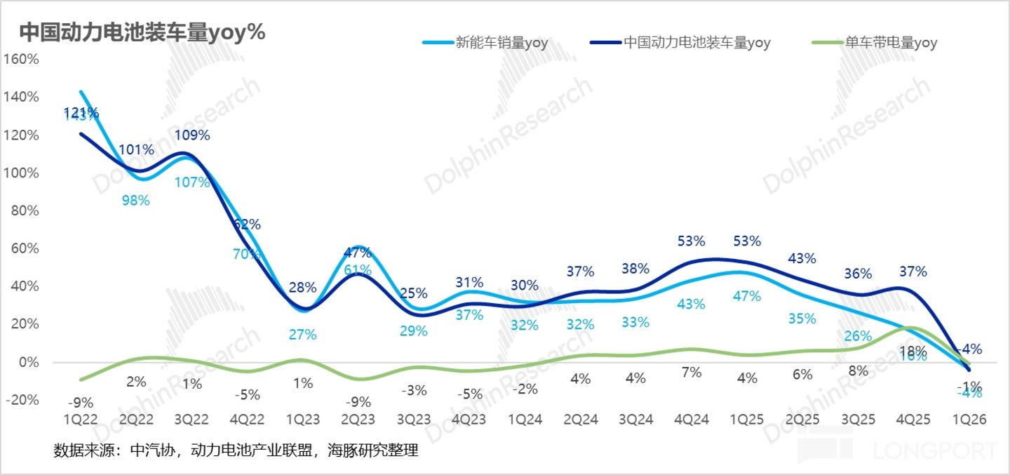 动力电池领跑行业,带电量“杠杆效应”爆发:动力电池出货约 150GWh(同比+56%),远超国内新能源车销量增速(-4%)。这背后的核心逻辑在于“行业 Beta 升级”:乘用车标配长续航以及高带电量商用车渗透率跃升带来的 1:4 需求杠杆效应已全面兑现。