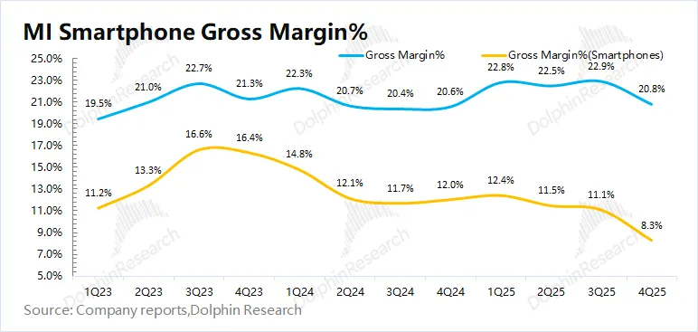 2025年的财报显示,小米手机毛利率已下滑至10.9%,其中,四季度的毛利率只有8.35%。高盛在此前的研报中预测,2026年小米手机业务将亏损约41亿元,手机毛利率将下滑至8%。