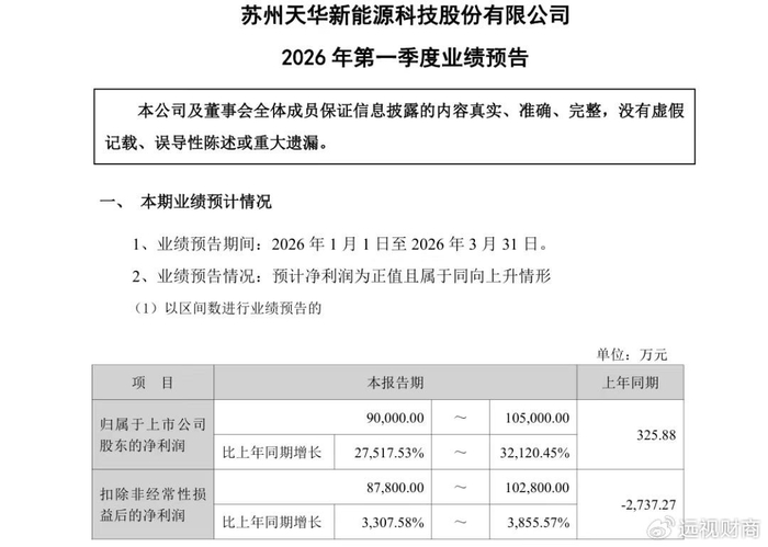 就像刚刚在4月8日,因为公布2026年第一季度财务预告而震撼整个A股的天华新能。公司净利润最高预增32120.45%,从去年同期的325万元狂飙至9-10.5亿元,直接拿下A股一季度预增王。