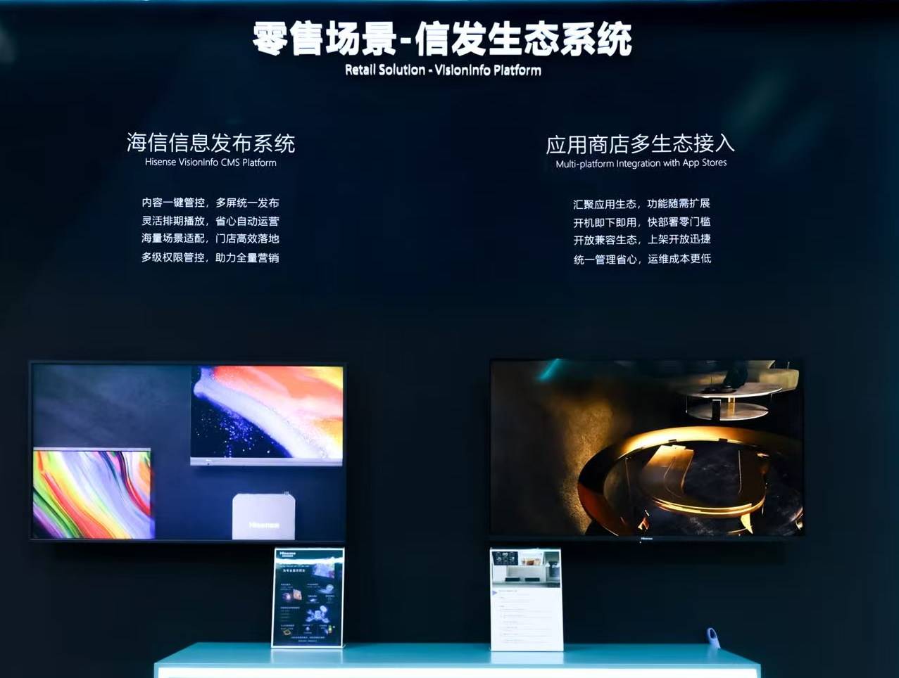 展会现场特设海信茶饮、快餐、折扣零食等零售场景展区,通过展示数字标牌产品与信发智控系统,打造“软硬”一体、便捷高效的零售行业数字化升级方案。依托 20 +零售业态深度洞察,为全球茶咖、餐饮、鞋服、商超等泛零售品牌提供定制化商显服务,通过高清显示、智能内容管理、远程运维等能力,助力零售门店提升展示效果、降低运营成本、强化品牌形象。
