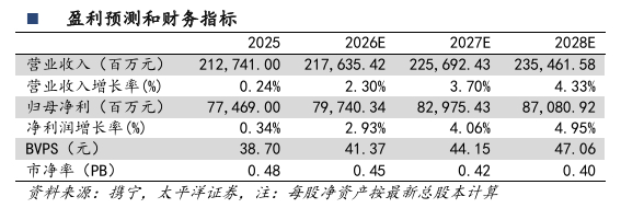 投资建议:公司资产投放加速向新动能转变,重点领域风险化解加速推进,盈利能力持续修复。预计2026-2028年公司营业收入为2176.35、2256.92、2354.62亿元,归母净利润为797.40、829.75、870.81亿元,BVPS为41.37、44.15、47.06元,对应3月27日收盘价的PB估值为0.45、0.42、0.40倍。维持“买入”评级。